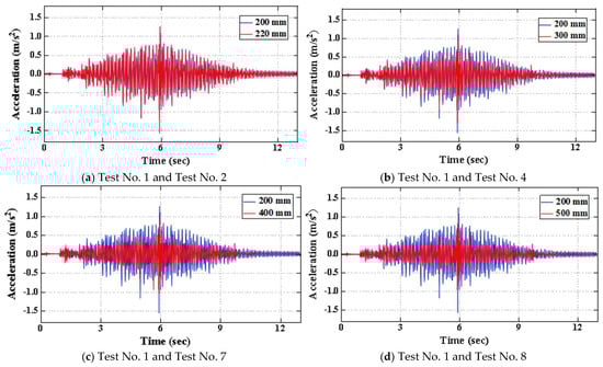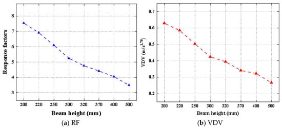 - Increasing the height of the Deltabeam effectively enhances the stiffness of the Deltabeam–CLT composite floor, thereby reducing its vibration response under human-induced vibration. When the height of the composite steel Deltabeam is increased from 200 mm to 500 mm, the first natural frequency of the Deltabeam–CLT composite floor increases by 23.07%. At the same time, its VDV and RF decrease by 57.7% and 53.7%, respectively, meeting the maximum limit requirements outlined in BS 6472 and ISO 10137.