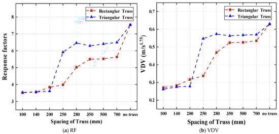 - Reducing the spacing of the trusses can effectively enhance the serviceability of the Deltabeam–CLT composite floor. By decreasing the truss spacing from 700 mm to 100 mm, the RF and VDV of the Deltabeam–CLT composite floor with rectangular section trusses decreased by 37.56% and 49.34%, respectively, while for the floor with triangular section trusses, the RF and VDV decreased by 45.54% and 54.21%, respectively.