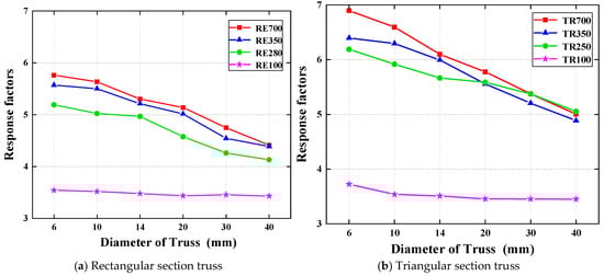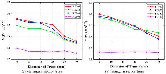 - Changing the diameter of the truss members shows a better vibration reduction effect when the truss spacing is under 100 mm. Although the natural frequency of the Deltabeam–CLT composite floor did not change significantly as the truss member diameter increased from 6 mm to 40 mm, its dynamic performance improved considerably, with RF and VDV decreasing by up to 27.44% and 32.39%, respectively.