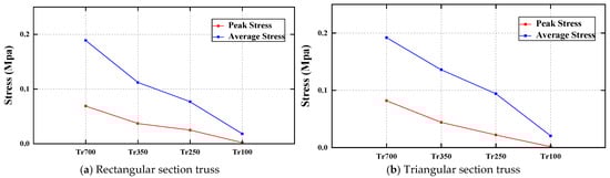 - An optimization scheme for vibration serviceability was proposed by embedding a steel truss within the Deltabeam. Two types of truss cross-sections, rectangular and triangular, were designed. The results of the numerical simulation indicate that, compared to the standard Deltabeam composite beam with a height of 200 mm, the incorporation of a steel truss with a spacing of 100 mm and a rod diameter of 10 mm leads to a maximum reduction in the RF and VDV of the Deltabeam–CLT composite floor by 45.54% and 54.21%, respectively, achieving the same vibration reduction effect as increasing the beam height to 500 mm.