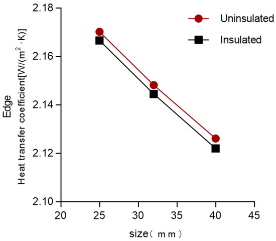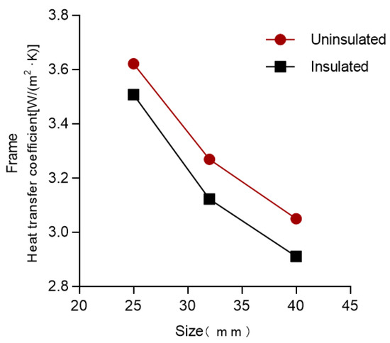 As illustrated in Figure 9, the length of the thermal break exerts a more substantial influence on the thermal performance of the profile nodes, particularly in the following two respects: Firstly, within the range of 25 mm to 40 mm, the impact of the thermal break length on the heat transfer coefficient of the frame surpassed that on the edge of the heat transfer coefficient. Secondly, with an increase in the length of the thermal break, both the heat transfer coefficients of the frame and the edge underwent a reduction, exhibiting a linear relationship. The primary reason for this is the superior thermal performance of the thermal break material in comparison to that of aluminum alloy. A composite strip composed of a 25% glass fiber polyamide 66 (PA66) blend exhibited a thermal conductivity of 0.30 W/(m·K). This value is equivalent to 1/530 of that observed in aluminum alloys, thereby significantly diminishing the rate of heat conduction.