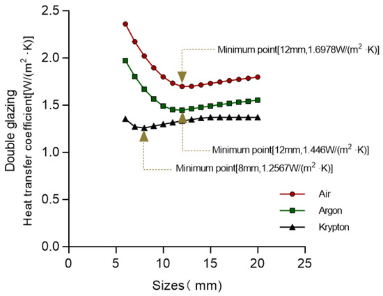 Utilizing 5 mm (low-e) + 5 mm insulating glass as the constant entity, Window7.8 software was employed to simulate the filling of the cavity with various gas types and thicknesses, as illustrated in Figure 8. As is apparent from the figure, the different gas types and thicknesses had significant impacts on the thermal performance of the glass, which predominantly manifested in three aspects: Firstly, for the configuration of double-glazed glass composed of 5 mm (low-e) + 5 mm layers, there was no consistent decline in the heat transfer coefficient of the glass with an increase in the width of the interlayer between the gases, regardless of the gas type, either air, argon, or krypton. The figure indicates an initial reduction, a subsequent rise, and eventual stabilization. Secondly, for a specific hollow glass cavity, the thermal performance of the glass varied according to the different gas fillings used; in this case, the order of the heat transfer coefficient was air > argon > krypton. Thirdly, within the range of 6–20 mm, the three gases were observed to demonstrate optimal performance values. The optimal thickness of the air filling was determined to be 12 mm, with a heat transfer coefficient of 1.6978 W/(m2·K); the optimal thickness of the argon filling was determined to be 12 mm, with a heat transfer coefficient of 1.446 W/(m2·K); and the optimal thickness of the krypton filling was determined to be 8 mm, with a heat transfer coefficient of 1.2567 W/(m2·K).