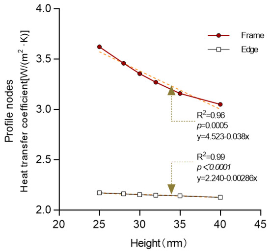 The linear fitting of the data using GraphPad Prism10.0 resulted in model equations (Equations (2) and (3)) for the insulating strip length for the frame and edge heat transfer coefficients. The p-values of the two equations were 0.005 and <0.001, respectively. Furthermore, the R2 values were 0.96 and 0.99, indicating a strong correlation between the dependent and independent variables in both cases. The two models under consideration were well constructed, and the equations explained the relationship between the independent and dependent variables satisfactorily.