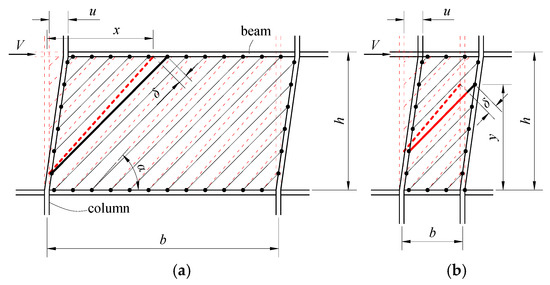 To establish the shear–deformation relationship of the wall, it is essential to correlate the strain of the tensile strip with the deformation of the wall, which can be accurately derived using the tensile strip model in conjunction with the geometric relationships illustrated in Figure 1.
