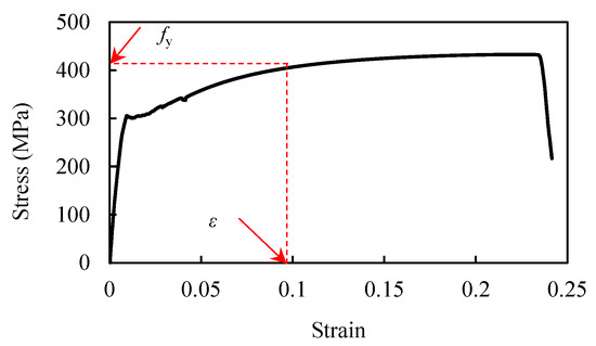 For a specified displacement u at the top of the SSW, the strain in the tensile strips can be accurately calculated by Equations (2) and (3). With the strain determined, the yield stress fy can then be derived by considering the hardening effects of steel, as outlined in the associated stress–strain relationship shown in Figure 2. This procedure for obtaining the stress–strain relationship is both practical and cost-effective, facilitating the integration of material properties into structural design.
