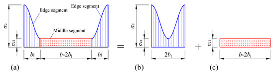 Step 4: The vertical stress on the wall will weaken the shear strength of the wall, which was considered by the proposed three-segment distribution (see References [19,20]). Considering the vertical stress of the wall, the yield stress of the tensile strip σty is smaller than that without considering the vertical load. σty is calculated by Equation (7). In Equation (7), fy is directly obtained from the material’s stress–strain curve at strains determined by Equations (2) or (3), and σ(x) is the vertical compression stress obtained by the three-segment distribution.