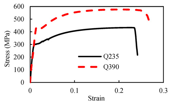The authors completed a test on a one-storey shear wall (SSW) specimen, as shown in Figure 5, measuring 0.75 m in height and 1.10 m in width, with a wall thickness of 2.10 mm. The infill steel wall comprised Q235 steel, characterized by a yield strength of 232.1 MPa, while the boundary frame was constructed from Q390 steel, exhibiting a higher yield strength of 456.2 MPa. The boundary columns were designed as built-up sections of dimensions 100 × 100 × 6 × 8, and the top beam measured 150 × 100 × 6 × 9, all featuring rigid beam-to-column connections. An axial load of 486.2 kN was applied, generating an axial stress of approximately 100 MPa in the boundary columns. Subsequently, horizontal cyclic loading was introduced, incrementally increasing by 50 kN until the initial yield in the steel wall was observed. The loading protocol incorporated displacement-controlled loading during the push phase and force-controlled loading during the pull phase, with the maximum pull load capped at 100 kN. This approach simulated earthquake conditions, highlighting the effectiveness of the finite element method (FEM) in evaluating the wall’s performance. The deformation of the SSW was obtained by using two linear variable differential transformers (LVDTs). The mechanical properties of Q390 steel and Q235 steel are shown in Figure 6 and listed in Table 1.