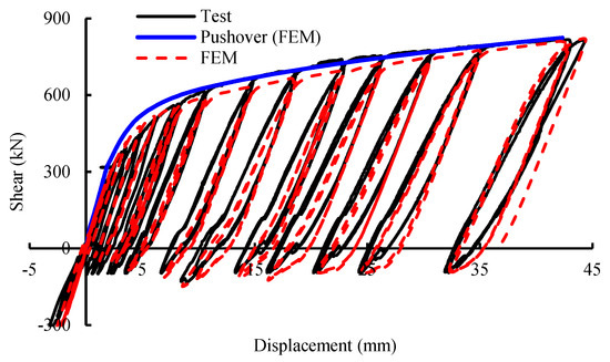A refined finite element method (FEM) simulation utilizing layered shell elements was employed to assess the test conditions, with an element size of 10 mm established through sensitivity analysis. The initial wall imperfection was modeled using the first mode shape, which showed a maximum out-of-plane deformation of 1/500 of the wall height. The plastic-kinematic model was selected to simulate the property of the steel. The yield stress of different steels is shown in Table 1. After yielding, the strain hardening modulus in the stress–strain relationship is 1% of the elastic modulus Es. The walls were fully constrained at the bottom. For the vertical and top boundaries, all the degrees of freedom were constrained except the vertical one. A load was applied at the top of the boundary columns, and pushover analysis was conducted subsequently. Results presented in Figure 7 indicate a strong correlation between the hysteresis curves from the finite element analysis and the experimental data, although the pushover analysis yielded slightly higher shear strength and stiffness values.