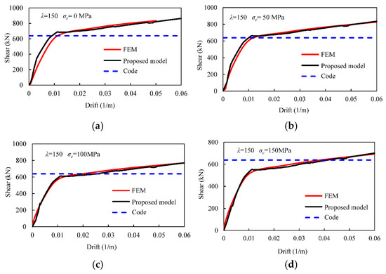 Shear–drift relationships of the wall with a slenderness of 150 under (a) 0, (b) 50, (c) 100, and (d) 150 MPa.