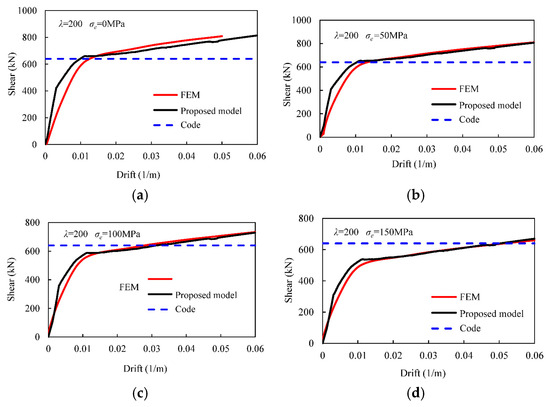 Shear–drift relationships of the wall with a slenderness of 200 under (a) 0, (b) 50, (c) 100, and (d) 150 MPa.