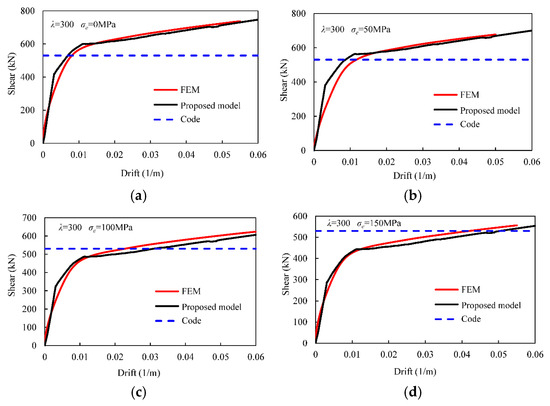Shear–drift relationships of the wall with a slenderness of 300 under (a) 0, (b) 50, (c) 100, and (d) 150 MPa.