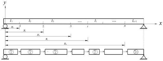 A simply supported Euler–Bernoulli beam with n transverse cracks is illustrated in Figure 1. The beam is characterized by an isotropic material composition and a uniform rectangular cross-section. For analytical simplification, all the cracks are assumed to remain open throughout the loading conditions. Each transverse crack is represented as a massless rotational spring in the theoretical model, effectively capturing the local flexibility induced by the crack. The geometric parameters of the system are defined as follows: denotes the length of the i-th beam segment bounded by adjacent cracks, and represents the coordinate of the i-th crack location along the beam axis.