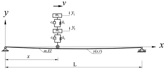 As illustrated in Figure 2, the vehicle is modeled as a two-degree-of-freedom spring–damper–mass system. In this schematic representation, m1 denotes the mass of the vehicle body (sprung mass), while m2 represents the combined mass of the bogie structure and wheel set (unsprung mass). The system parameters are defined as follows: k1 signifies the suspension stiffness, k2 signifies the tire stiffness, c1 represents the suspension viscous damping coefficient, c2 represents the tire viscous damping coefficient, and v indicates the vehicle’s traveling velocity. The dynamic response of the system is characterized by y(x,t), which denotes the vertical deflection of the bridge’s center line at position x and time t. Additionally, y1(t) and y2(t) represent the absolute vertical displacements of masses m1 and m2, respectively, measured relative to a fixed reference frame.