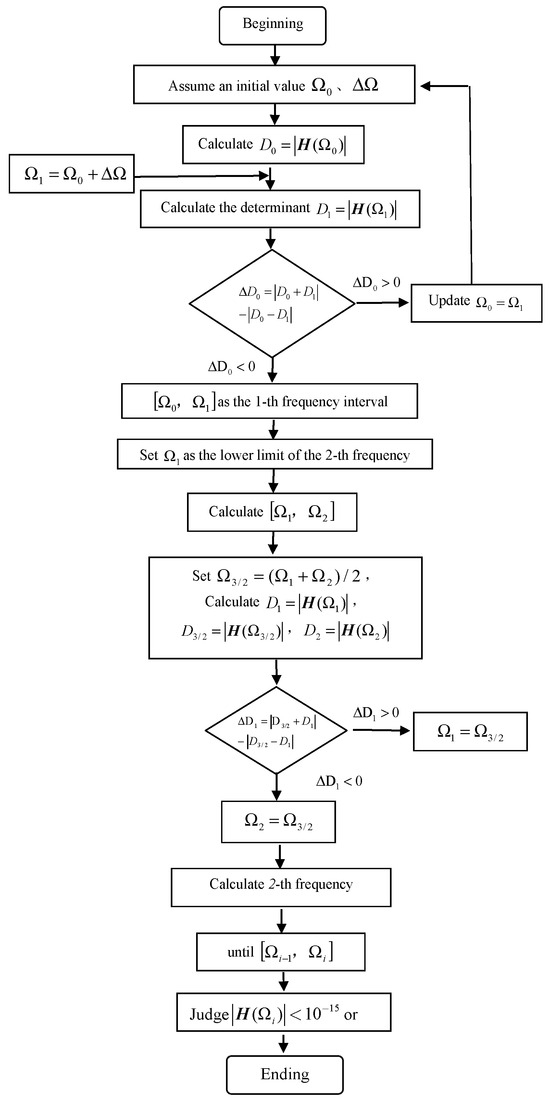 (6) Repeat step (5) until achieving a target difference within specified limits for each frequency interval. Substitute median values from these angular frequency ranges into their respective matrices such that their determinants approach zero (), thus confirming that this median represents the i-th order angular frequency.