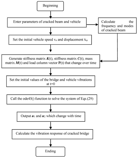 The system of Equation (29) can be solved for its analytical solution by writing a program using the Runge–Kutta method, the computational flowchart for the vehicle–cracked simply supported beam coupled system is illustrated in Figure 4.