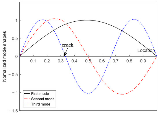 Normalized mode shapes of a simply supported beam with a crack.
