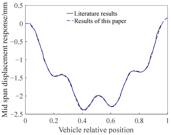 To validate the proposed vehicle–cracked Beam coupling methodology, a comparative analysis was conducted against the benchmark results reported in Ref. [34]. The validation framework employs a simply supported beam characterized by the following parameters (Figure 6): beam length L = 20 m, cross-sectional moment of inertia I = 0.3229 m4, modulus of elasticity E = 3.0 × 109 N/m2, and mass per unit length m = 2.5 × 103 kg/m. The vehicle parameters comprise the vehicle body mass m1 = 32,025 kg, combined suspension and tire mass m2 = 1425 kg, spring stiffness k1 = 6.5 × 105 N/m, and traversing velocity v = 100 km/h. Damping effects in both the vehicle and bridge subsystems were neglected to isolate the fundamental dynamic coupling behavior. Numerical simulations were specifically focused on quantifying the transient mid-span vertical displacement response under moving vehicle excitation.