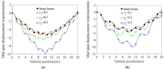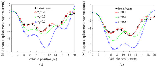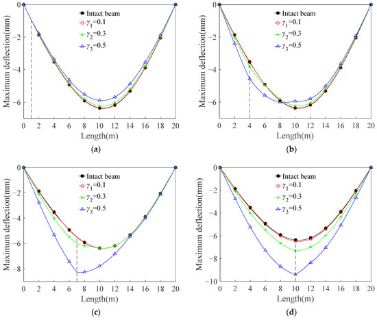 A systematic computational investigation was performed to quantify the maximum deflection distribution along the beam span under varying crack configurations. Deflection profiles were numerically acquired at a vehicular speed of 40 m/s, with detailed spatial distributions documented in Figure 10.