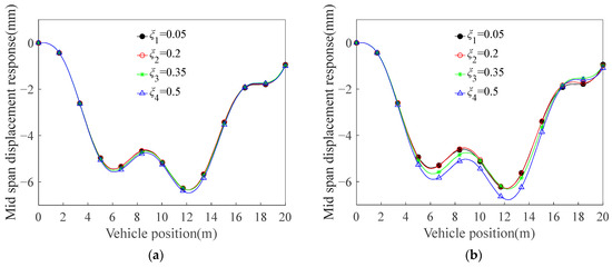 Figure 8 illustrates the dynamic evolution of mid-span displacement responses under four distinct crack configurations (depth ratios = 0.1, 0.2, 0.3, 0.4, and 0.5) at a constant vehicle speed of 40 m/s, with particular emphasis on crack position effects ( = 0.05, 0.20, 0.35, and 0.50). The analysis reveals two critical observations: