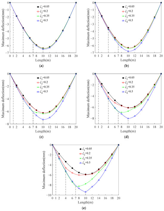 The intermediate deflection response across the span under different crack depths and crack positions: (a) ; (b) ; (c) ; (d) ; (e) .