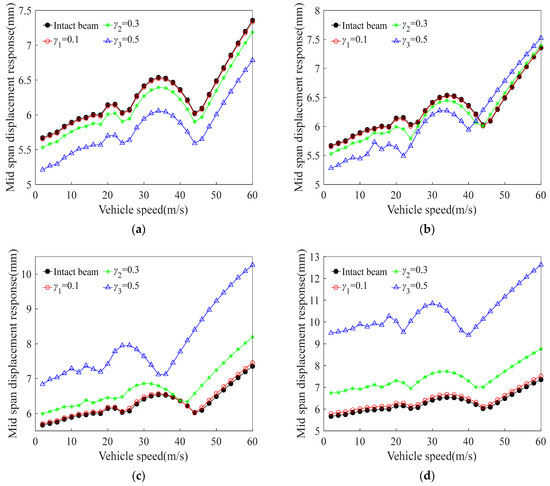 Effect of cracks on maximum deflection at different vehicle speeds: (a) ; (b) ; (c) ; (d) .