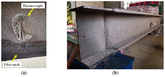 Before applying the fire-retardant coating, the surface of the steel beam was de-rusted and polished. Subsequently, a primer for the fire-retardant coating, approximately 2–3 mm thick, was initially sprayed onto the surface to enhance adhesion. Given that the heating length of the beams is 4500 mm, the length of the fire-retardant coating was set to 5000 mm to ensure that the heated section is adequately protected. Although the steel beam was exposed to fire on three sides, the coating was also applied to the upper surface of the steel beam. After the base coating was completely dry, subsequent layers were applied until the target thickness was achieved, with each layer measuring between 5 and 10 mm. An interval of no less than 24 h was maintained between each application to ensure that the fire-retardant coating was fully dry. Once the total thickness reached 10 mm, a layer of fiber mesh (Figure 3a) was added to enhance the adhesion of the fire-retardant coating. When the target thickness was achieved, the surface was scraped flat to prevent variations in fire resistance caused by uneven coating, as illustrated in Figure 3b.