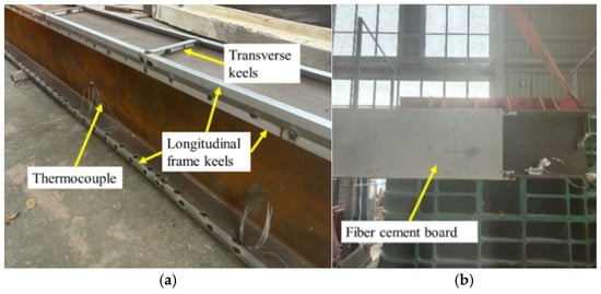 Two cement fiber fireproof boards measuring 340 × 2500 × 20 mm and four boards measuring 620 × 2500 × 20 mm were utilized for fire protection construction, as indicated in Figure 4. First, thin-walled angle steel with dimensions of 30 × 30 mm was welded to the flange of the steel beam to create a longitudinal frame keel. Next, transverse keels were installed every 1 m on the outer side of the lower flange, secured to both the longitudinal frame keels and the steel beam through welding. The longitudinal keels were employed to secure the fireproof boards on the left and right sides of the steel beam, while the transverse keels were used to anchor the fireproof panels at the bottom of the steel beam. As the steel beam was exposed to fire on three sides, the upper flange remained unprotected by fireproof boards. The fireproof boards and keels were connected using self-tapping screws. The self-tapping screw nuts were embedded into the board at approximately 1 cm, and the fire-retardant coating was applied to the screw holes to cover the nuts.