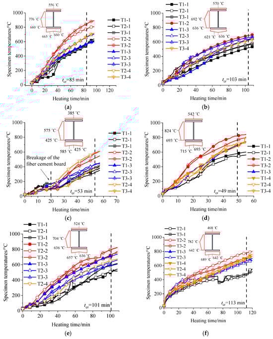Figure 11 illustrates the temperature of the specimen at various positions, and the location of the thermocouples is given in Figure 7. It is evident that the temperature rise curves at identical locations on different cross-sections are similar, indicating that the specimens were uniformly heated along their length. However, the temperature distribution across the cross-section was found to be significantly non-uniform, with the web generally exhibiting the highest temperature, except for specimen D-3, which was protected by a fiber cement board. This phenomenon occurred because the web of the steel beams with contour protection schemes was directly heated on both sides, whereas the web of specimen D-3 was not directly exposed to the fire. The lowest temperature on the cross-section was observed at the upper flange of the beams, which was heated on only one side. The temperature difference between the upper flange and the web could reach 300 °C, which may significantly influence the fire resistance behavior of the beams, as the upper flange contributes more to the overall stability of the steel beams, which may cause the steel beam to transform from lateral–torsional buckling failure to cross-sectional strength failure. In Figure 11c, a sudden increase in the temperatures of specimens T2-4 and T2-2 was observed at approximately 25 min, which may be attributed to the partial failure of the fiber fireproof board, resulting in the steel beam being directly exposed to the fire.