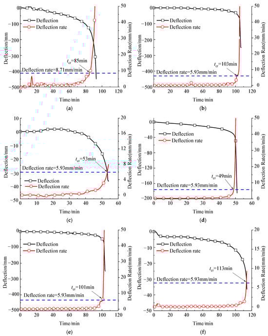 According to the Chinese specification (GB 9978.1 [27]) regarding fire resistance tests for beams, the failure criterion is defined as the point at which the deflection reaches L2/(400d) mm or the deflection rate reaches L2/(9000d2) mm/min. In this context, L and d represent the span length and web height of the beams, respectively. Consequently, the failure deflection and deflection rate of specimen D-1 are 196 mm and 8.71 mm/min, respectively, while the corresponding values for the other specimens are 134 mm and 5.93 mm/min.
