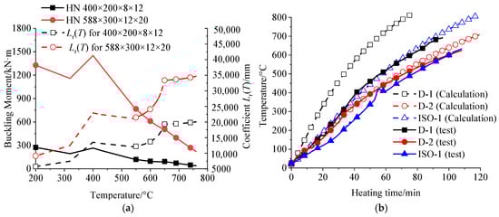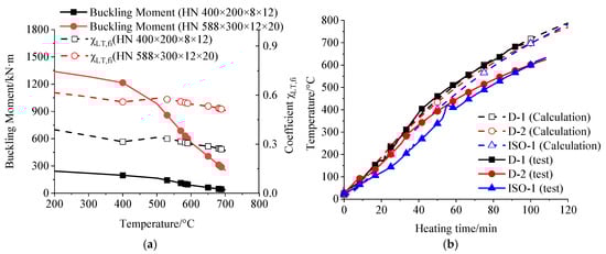 where fT denotes the designed steel strength at T °C, φbT denotes the stability coefficient of beams at T °C, and W denotes the cross-section modulus. It should be noted that the φbT is a temperature-dependent coefficient, and can be calculated by GB 50017 [24] and GB 51249 [23]. Thus, the ultimate moment (MT) versus temperature curves can be determined by Equation (1), and the critical temperature (Tcr) can be calculated. Equations (2) and (3) show the reduction factors of the yield strength (ηsT) and elastic modulus (ꭓsT) at elevated temperatures, as specified in GB 51249-2017 [23].