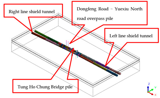 The model size is set as 350 m × 200 m × 50 m. The stratum and ramp underpinning beams are simulated by solid elements, the tunnel segments and in-tunnel grouting reinforcement are simulated by 2D plate elements, and the bridge piles are simulated by 1D beam elements. Bridge piles were modeled as 1D beam elements with material properties matching C35 concrete (E = 31,500 MPa), while grouted zones used a homogenized stiffness (E = 3000 MPa) to simulate improved soil–pile interaction, reducing lateral deformation through increased radial confinement. As shown in Figure 2 and Figure 3.