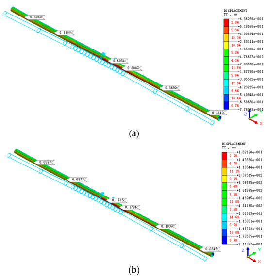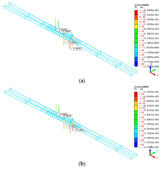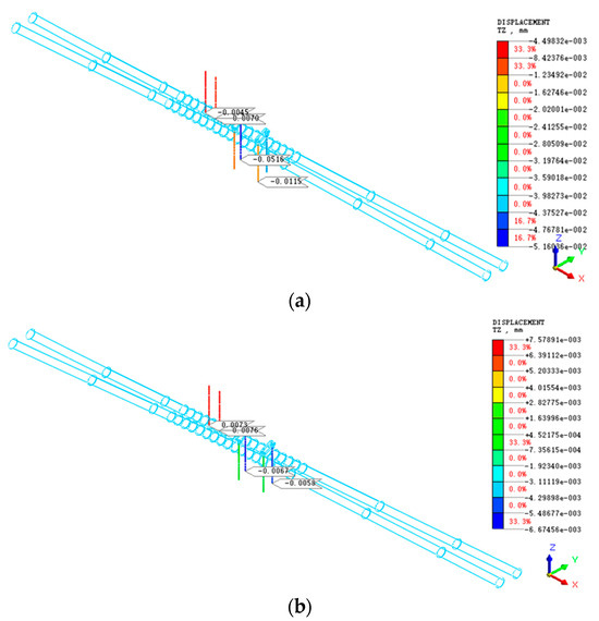 Vertical displacement cloud images: (a) vertical displacement of bridge piles under the condition without in-tunnel grouting (mm); (b) vertical displacement of bridge piles under the condition of in-tunnel grouting (mm).