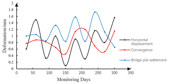 Analysis of settlement curves demonstrates that maximum subsidence occurs along the shield tunnel centerline, gradually decreasing symmetrically toward both sides. Excavation of the right-line shield tunnel induces lateral unloading on the left-line tunnel, resulting in vertical convergence and horizontal dilation of segments, necessitating monitoring and analysis of these deformations. To evaluate the deformation impacts of the “tunnel-first-station-later” construction method on segments and bridge piles, 300-day long-term monitoring data were analyzed. Daily maximum deformation values were extracted to generate the deformation curve shown in Figure 9.