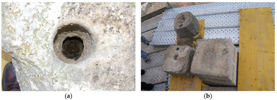 View of the hole where the wooden log was formerly allocated. (a) Hole at the highest piece of the pinnacle. (b) Stone pieces of the pinnacle disassembled.