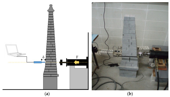 The failure mechanism of different dry-joint masonry structural members has been tested in a laboratory. In [8], the particular case of overturning masonry walls was simulated. Two types of local stone—one calcareous and the other basaltic—were used in the tests. For this purpose, a tilting platform rotating on a horizontal axis parallel to the length of the specimen was used as a destabilizing factor. In [9], the behaviour of dry-joint masonry was tested in a scaled-up set of arches. The triggering effect for the instability of the structure involved imposed displacements at the lateral restrains. Similar tests performed using different materials were summarized in this report.