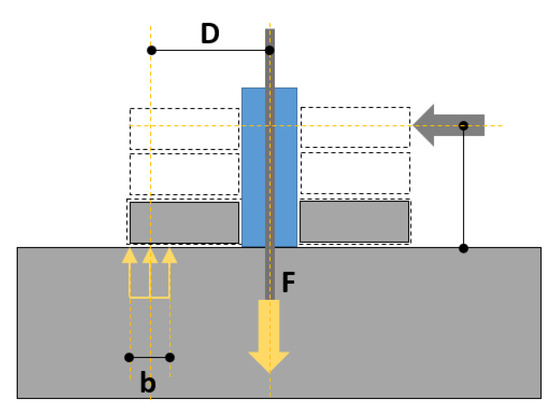 D is the distance between the compressed zone and the position of the titanium bar, A equals the compressed area (b multiplied by the length of the perpendicular edge (Ledge)), F is the force supported by the reinforcement, and Cstress is the compression stress in the masonry specimen due to the bending moment: