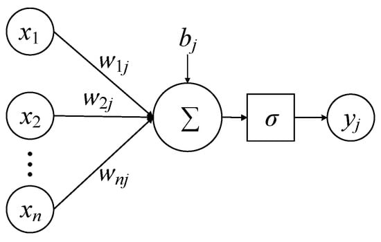 As a subclass of machine learning (ML), DL is extensively applied in various social production and practice scenarios. DL evolved from research on artificial neural networks (ANNs), which are a class of models defined by multilayer network architectures. DL learns the effective information hidden between the incoming data of the input layer by constructing a multi-layer neural network, weights and calculates the results, and transmits them to the output layer through the activation function, and then establishes an intricate nonlinear mapping between the input and output. The deep neural network (DNN), serving as the fundamental algorithm of DL, also serves as the basis of deep learning model architectures such as CNN, RNN, and GAN. It is well suited for addressing general data problems without specific structural characteristics, offering strong versatility and generalization capabilities [29]. Hence, this paper adopts DNN. A DNN is mainly composed of three parts: input layer, hidden layer, and output layer, each of which is composed of a certain number of neurons. The schematic diagram of a single neuron is shown in Figure 1. The input of neuron j is xi, where wij is the weight value between the input xi and neuron j. After the weighted sum is added with the bias value bj of neuron j, the output yj of neuron j is ultimately determined by an activation function σ. The activation function imitates the threshold activation characteristics of human brain neurons, introduces nonlinear features into DNN, and enables the transformation from simple linear space to highly nonlinear space [30].