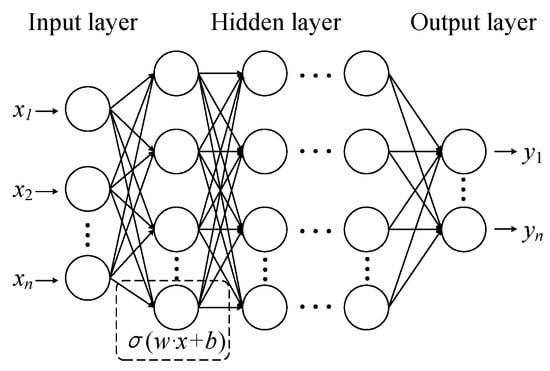 The DNN schematic diagram is shown in Figure 2. DNN employs forward propagation to transfer data into the neural network and learns the effective information hidden between the data transmitted by the input layer through the neural network. The lower-layer neurons receive the input information transmitted by the upper-layer neurons and calculate the weighted results. The error is obtained by the calculation of the backpropagation loss function, and it is passed to the output layer through the activation function. The weights and bias parameters between neurons are continuously adjusted by the optimizer during the process so that the predicted results are infinitely close to the target, and the complex nonlinear mapping from input to output is achieved. In general, DNN is a nonlinear function in nature. Assuming that the selected activation function is σ, the output of the final output layer is y, the total number of layers is l, the output of the hidden layer is ai (1 < i < l), the weight matrix is Wl, and the bias vector is bl, and utilizing the matrix form, the formula for the DNN can be expressed as Equation (1):