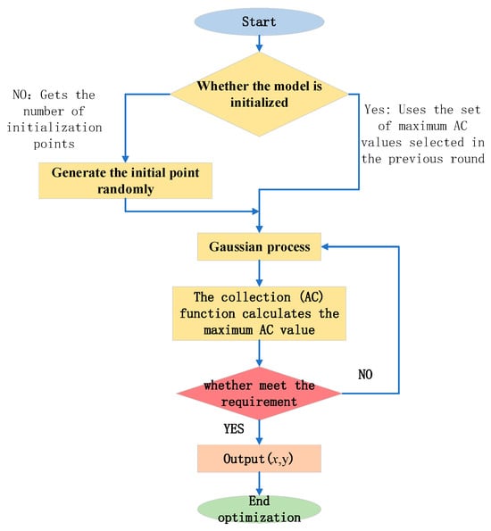 BO optimization primarily comprises two components: a probabilistic surrogate model and an acquisition function. The probabilistic surrogate model represents the distribution of the objective function to be optimized, and the acquisition function is utilized to seek and confirm the next possible extreme point from the posterior distribution. The acquisition function serves two purposes: one is for exploitation, and the other is for exploration. Exploitation is sampling around existing extremes to search for possible better hyperparameter combinations. Exploration is exploring new areas to prevent the optimization from getting trapped in local optima. The primary optimization process is initially generating a probability surrogate model through random sampling and updating the posterior distribution of the objective function (Gaussian process) by continuously adding sample points until the posterior distribution closely approximates the real distribution. In short, this approach considers information from previous parameters to better adjust the current parameter. Its theoretical foundation is based on Bayes’ theorem, as depicted in Equation (2). The flowchart of Bayesian optimization is shown in Figure 3.
