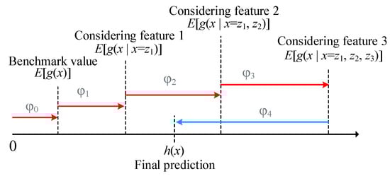 It can be observed that SHAP interprets the model’s final prediction for the sample as the sum of the effects of each feature φi, which introduces conditional expectations. Therefore, SHAP can reflect the degree of influence and positive and negative correlation of each feature in each sample, not only providing the importance of input features but also showing how each feature affects the final prediction. The final prediction is obtained by summing the SHAP values φi of all input features.
