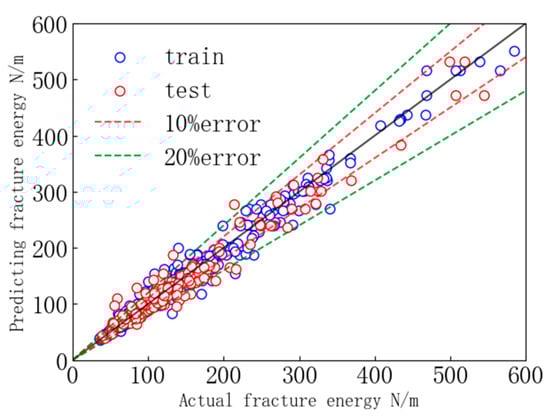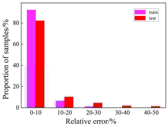 Figure 7 shows the prediction results of the DNN model on the training set and test set, and Figure 8 shows the relative error percentage distribution of the training set and test set. The R2 of the model on the training set and test set is 0.973 and 0.953, respectively. Overall, the model exhibits strong predictive performance on both the training and test sets, with most of the data points closely distributed on both sides of y = x, except for a few data points that exhibit high dispersion. Approximately 92% of the prediction results in the training set fall within a range of error of 10%, and roughly 87% of the test set results exhibit a relative error below 10%. The proportion of data points with a relative error within 20% is over 90% for both sets, and only about 6% of the test set results have a relative error exceeding 20%.