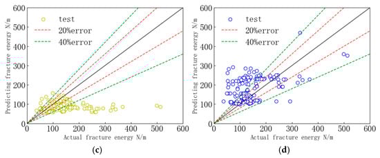 The above empirical formulas were used to calculate the test set data, respectively, and the results of each empirical formula and the DNN model prediction results were compared with the test result data as shown in Figure 9. As can be seen from Figure 9, when GF is less than 200 N/m, the predicted values of the Bažant formula and CEB-90 are in better agreement with the experimental values, while the predicted value of JSCE is on the high side with a large error. When GF is greater than 200 N/m, the GF values predicted by the Bažant formula and CEB-90 are generally low, with very large prediction errors, while the values predicted by JSCE are relatively better. However, the GF predicted by the DNN model is significantly less discrete than the other three empirical formulas, with higher accuracy and stability. It indicates that the DNN model can better predict the fracture energy of concrete than the traditional empirical formulas and has a wider application range.