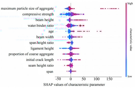 Similarly, the SHAP values of beam height, age, beam width, ligament height, and span exhibit a gradual positive trend with increasing characteristic parameters, indicating that the fracture energy increases with the increase in beam height, age, beam width, ligament height, and span. Water–binder ratio, span–height ratio, and initial crack length show negative effects on fracture energy. However, the proportion of coarse aggregate and the seam height ratio did not clearly show the influence trend on the fracture energy in Figure 10, and the SHAP value of the seam height ratio was mostly distributed near 0, indicating that this characteristic parameter contributed little to the overall model. The seam height ratio, defined as the ratio of a0 and W, is one of the main size parameters affecting the fracture energy of concrete. However, the outcomes obtained from SHAP analysis are not obvious, which may be caused by the limited range of seam height ratio in the data set, and should be carefully considered in future research endeavors.