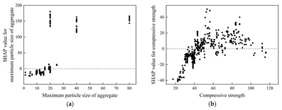 As can be seen from Figure 11a, the SHAP value of the maximum particle size of aggregate increases with the increase in particle size, reaching its peak at 20 mm and subsequently stabilizing. When the aggregate particle size is below 15 mm, the SHAP value is negative, which adversely impacts fracture energy, which is also consistent with the majority of test observations. The above phenomenon can be explained as follows: the specific surface area of aggregates with different particle sizes varies, and cracks typically form along the bonding interface layer between aggregate particles and cement mortar. The cement mortar on the surface of smaller-sized aggregates is relatively limited, thereby impacting the bonding strength of the interface layer. When the aggregate particle size increases, the cement mortar wrapped on the aggregate surface increases, increasing the bonding strength between the interface and the fracture energy.