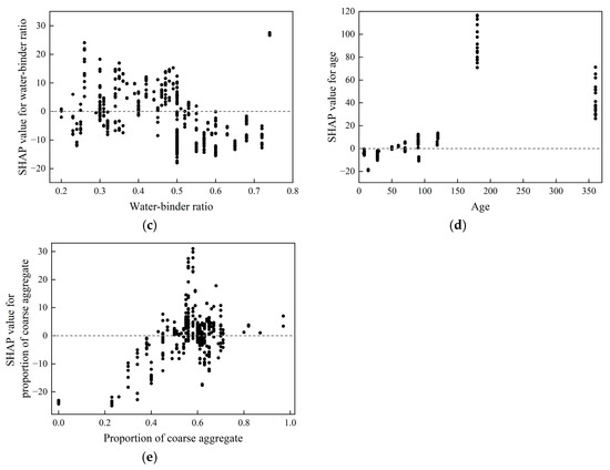 SHAP feature dependency graph: (a) SHAP value variation of maximum particle size of aggregate; (b) SHAP value variation of compressive strength; (c) SHAP value variation of water–binder ratio; (d) SHAP value variation of age; (e) SHAP value variation of proportion of coarse aggregate.