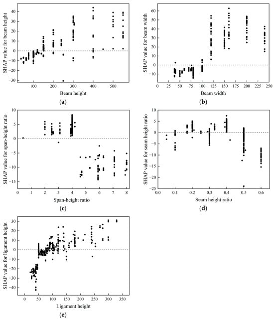 SHAP feature dependency graph: (a) SHAP value variation of beam height; (b) SHAP value variation of beam width; (c) SHAP value variation of span–height ratio; (d) SHAP value variation of seam height ratio; (e) SHAP value variation of ligament height.