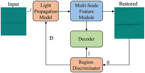 The proposed enhancement pipeline is depicted in Figure 1. The raw underwater image J is first processed via a physically-inspired light propagation module, which estimates degradation factors like background light and per-channel attenuation . The result is passed to a multi-scale feature extraction module with frequency-aware attention, which guides the decoder to recover high-resolution details. Meanwhile, a region-discriminator provides fine-grained supervision by focusing on texture realism and crack edge sharpness. The final restored image exhibits both global visibility and structural integrity of crack features.