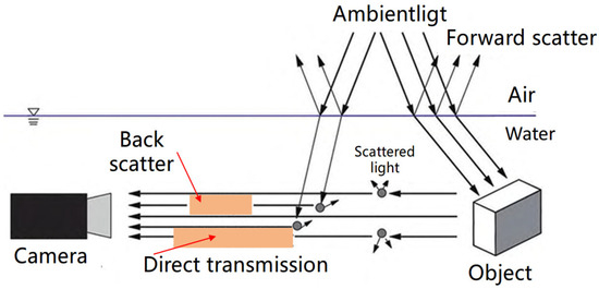 To simulate the degradation process of underwater images in reality, this paper introduces the light propagation theory based on the Jaffe–McGlamery model [31,32]. The degradation of underwater images mainly consists of three parts: absorption, scattering (as shown in Figure 2), and backward reflection of light, especially in the red and green light bands where degradation is most severe. In Equation (1), the observed underwater image in channel can be expressed as: