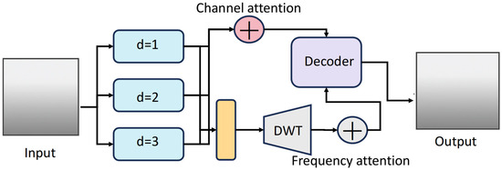 In the decoder Section, this paper introduces a multi-scale feature preservation module (MSFPM), which adopts a parallel dilated convolution structure (with dilation rates of 1, 2, 4) to effectively expand the receptive field and enhance the network’s modeling ability for cracks of different scales. The outputs of each channel are weighted and fused through an attention mechanism before being input into the decoder backbone, ultimately generating an enhanced image. This module significantly improves the ability to express details in the crack area of the image, especially in the restoration of edge information under complex background interference.