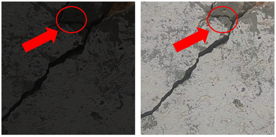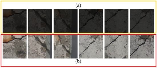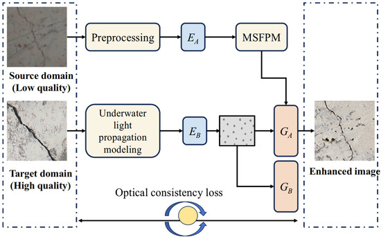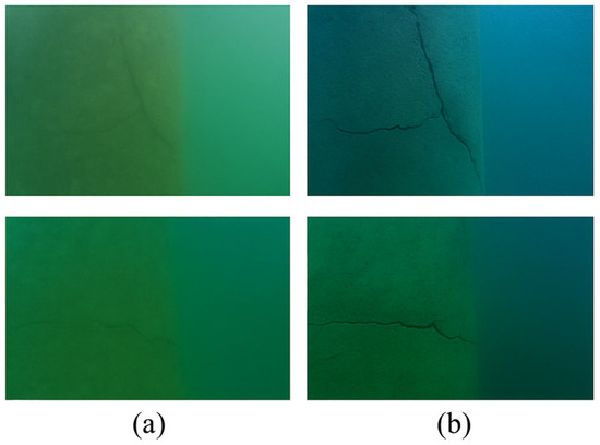Underwater infrastructure inspection plays a vital role in ensuring the safety and longevity of marine and civil engineering structures, such as bridge piers, offshore platforms, and dams [1]. Cracks are one of the most common and critical forms of underwater structural damage, as they may indicate material degradation, corrosion, or structural failure [2]. However, due to the challenging underwater environment, characterized by light attenuation, scattering, and color distortion, captured images often suffer from low contrast, blurring, and severe color degradation [3,4,5,6]. These issues not only hinder visual interpretation but also affect the accuracy of automated defect detection systems [7,8,9].